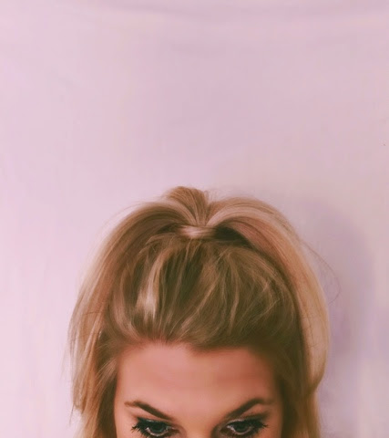 3.) Section hair from about the temple of your head upward and make a half up pony tail with a clear elastic band.